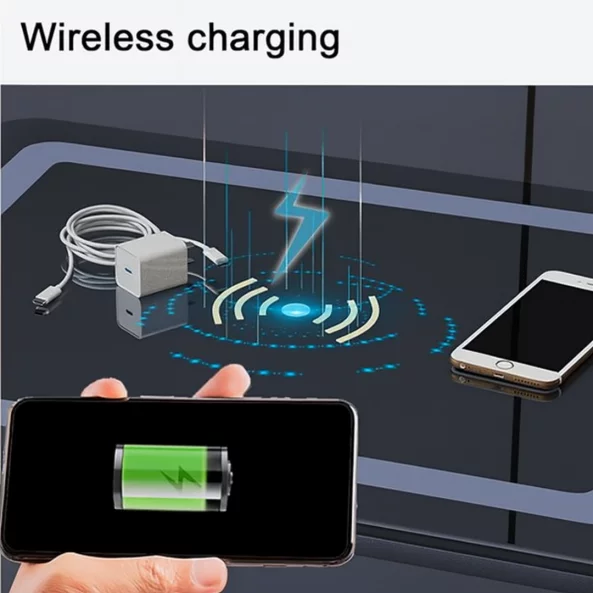 ✔️ 15W безжично зареждане – Плотът на шкафчето е снабден със специална повърхност, която позволява бързо и сигурно зареждане на телефони и съвместими устройства, без нужда от кабели.