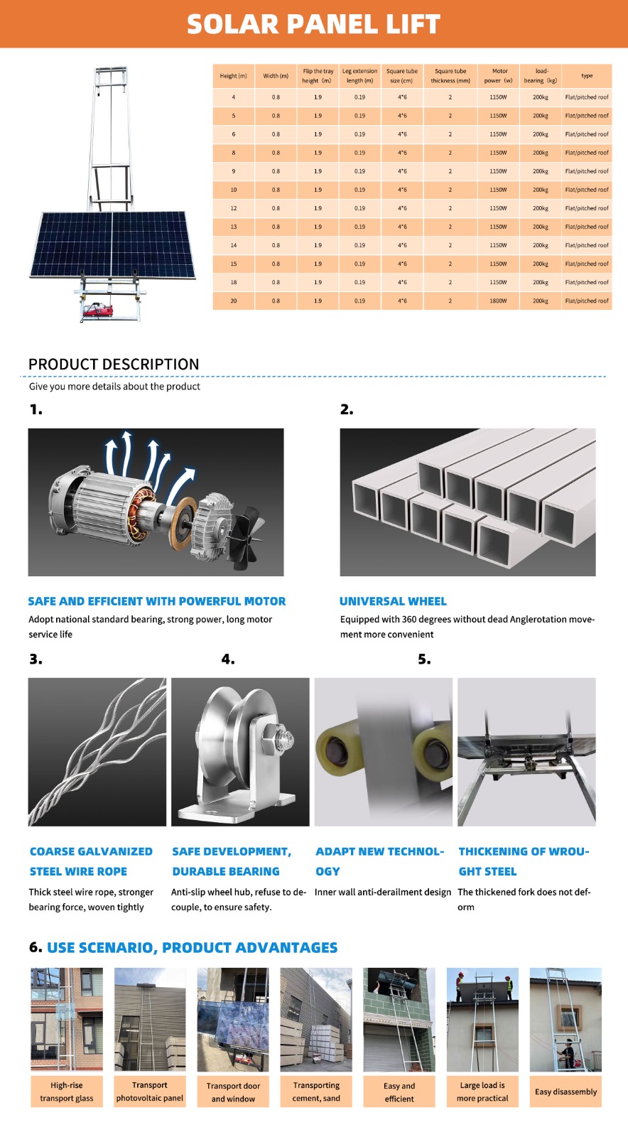 Todas las piezas tienen un peso total combinado de 78 kg. El cabrestante acelera significativamente el trabajo y ahorra tiempo. Tiene una velocidad de elevación de hasta 12-16 metros por minuto y una capacidad de carga de hasta 200 kilogramos. Está equipado con un carro de transporte adaptado para paneles solares. El elevador de paneles solares fue desarrollado para un transporte rápido, fácil y, sobre todo, seguro. Requiere poco espacio, se puede utilizar en lugares de difícil acceso y su instalación no requiere ninguna capacitación.