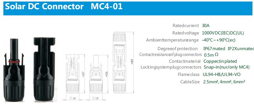 Két fotovoltaikus napelem összekapcsolási pontjain MC4 szabvány típusú szolár csatlakozókat használnak. Lehetővé teszik az elektromosan vezetékes elemek biztonságos és gyors összeszerelését.
